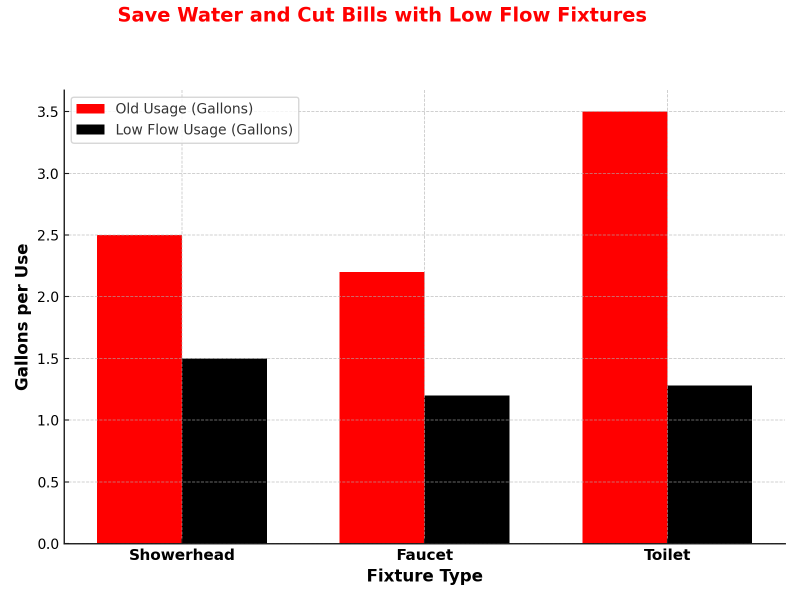 Fixture Type | Old Usage (Gallons) | Low Flow Usage (Gallons) | Savings per Year (Household of 4) |